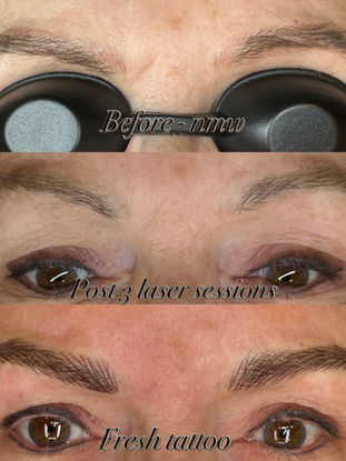 Most brows I fade take 2–3 sessions, though certain saturated or carbon-heavy brows can take up to 8. Many clients reach a “light enough” point for new brows long before full removal is complete. We must wait 6-8 weeks between sessions and then 8 weeks from last session to retattoo again.